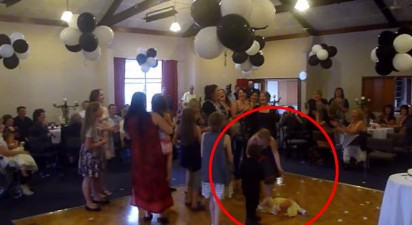 影片中,穿著白色婚紗的新娘背對著女性賓客們,準備拋出手中的捧花,而其中一名抱著黃衣小女孩的女子,看到拋過來的捧花大概是太開心了,竟然鬆開雙手去接,等到小女孩跌倒在地才又回神,趕緊彎腰將小女孩抱進懷裡,幸好看起來並沒有受傷。